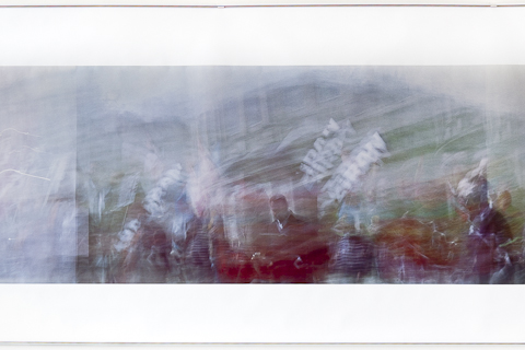 The film-strip depicts a section of a handheld cinematic pan of the 1st of May rally in Trafalgar Square 2015, transformed into one panoramic image, made with a conventional photographic camera.