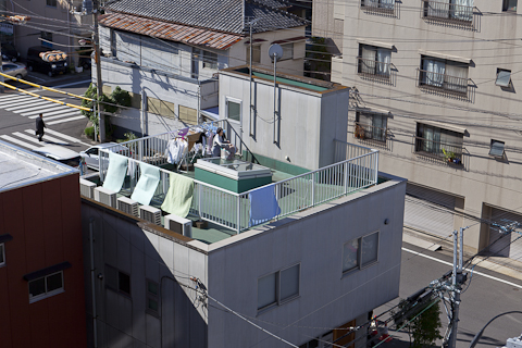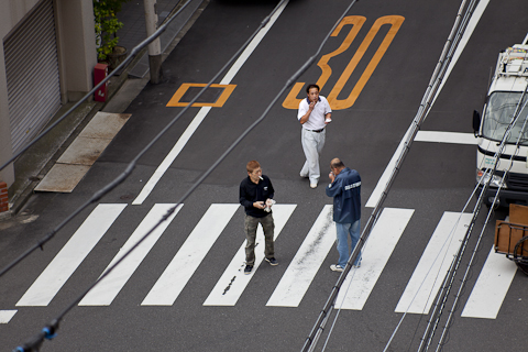 A series of photographs taken from my 6th floor apartment at Tokyo Wonder Site resembling the ‘blown off roof’ (fukinuki yatai) perspective of Japanese scrolls. During a Tokyo Wonder Site residency I traced rhythms of movement in commuting and demonstrating in Tokyo in film-strips and explored the negotiation of personal space in public places.