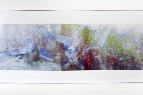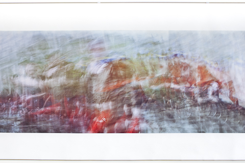 The film-strip depicts a section of a handheld cinematic pan of the 1st of May rally in Trafalgar Square 2015, transformed into one panoramic image, made with a conventional photographic camera.